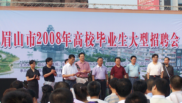 為進一步貫徹國務(wù)院辦公廳《關(guān)于切實做好2008年普通高等學(xué)校畢業(yè)生就業(yè)工作的通知》要求,充分發(fā)揮政府人事部門職能作用,合理引導(dǎo)、積極促進高校畢業(yè)生就業(yè),切實做好高校畢業(yè)生就業(yè)服務(wù)工作,眉山市人事局、東坡區(qū)人事局于7月30日在三蘇雕像,聯(lián)合舉行了“眉山市2008年高校畢業(yè)生大型招聘會”。